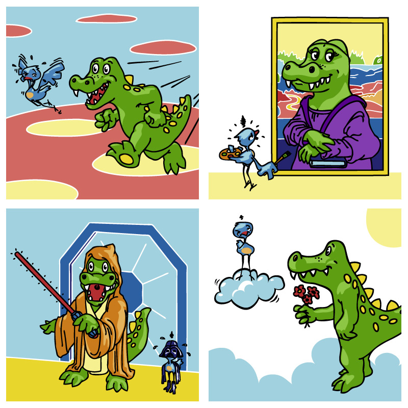 Die Migros hatte mal ein Krokodil als Leitfigur für die Kinderprodukte ihrer Zahnpflegemarke Candida. Diese Zeichnungen waren für eine Spiele Website.